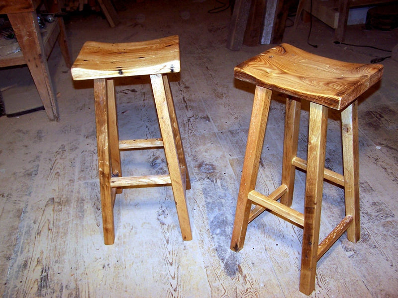 These custom bar stools are perfect for your kitchen island or basement bar. Shown here made from reclaimed wormy chestnut with mortise and tenon joinery, they are tough and durable, yet their scooped saddle seat design makes them snug and comfortable!