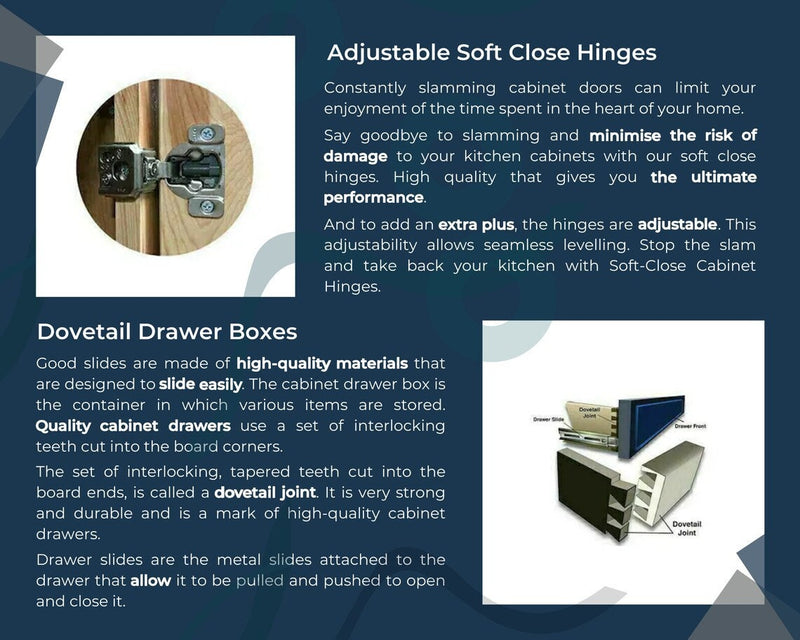 The cabinet drawer boxes use a set of interlocking teeth cut into the board corners to create a strong physical attachment at all four sides of the box. The set of interlocking, tapered teeth cut into the board ends is called a dovetail joint. It is very strong and durable and is considered to be a mark of high quality craftsmanship. The drawers come with sturdy undermount drawer glides that are soft closing just like the doors. By eliminating any chances of slamming the doors and drawers, your vanity will last for years to come.