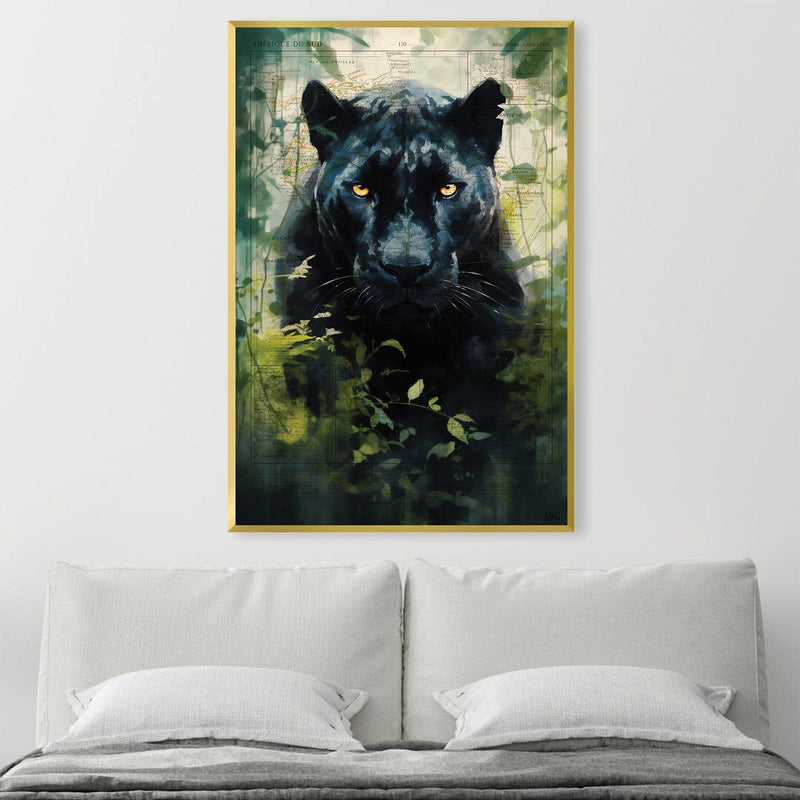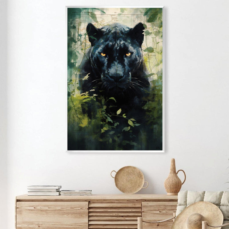 Capture the essence of strength and grace with this captivating watercolor canvas wall art featuring the "Black Panther Portrait." This stunning artwork portrays the majestic black panther against a backdrop of a map, adding an intriguing and adventurous touch to the piece. The use of black, green, and cream colors creates a striking contrast and brings the panther to life with a sense of power and elegance. Whether displayed as wall art, canvas art, or framed art, this remarkable depiction of the black panther will add a touch of wild beauty to your space.