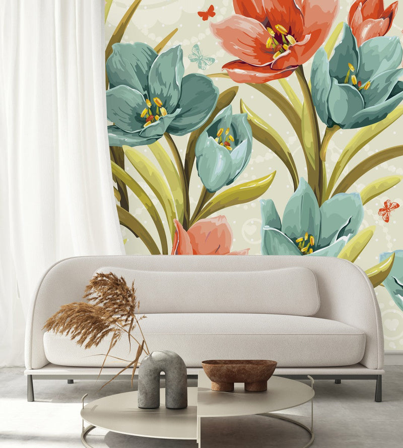 Step into a world of transformative aesthetics with uniQstiQ's Blue and Red Tulips Wallpaper. Distinctly different from traditional wallpaper, our murals don't follow the rhythm of repetitive patterns but instead, unfold in a sweeping narrative across your walls. They're created on a grand scale, designed to cover large expanses without the need to piece together patterns or navigate repeating designs.