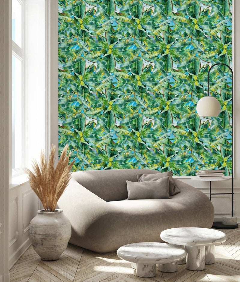 Surround yourself in the warmth and vibrancy of a tropical paradise with uniQstiQ's Blue Wallpaper with Green Palm Leaves. Inspired by the lush vegetation and radiant atmosphere of Florida, each design encapsulates a touch of Miami heat, inviting the outdoors into your living space. Our wallpaper patterns feature exuberant banana leaves, swaying palm fronds, and an intoxicating jungle theme that perfectly harmonizes with a tropical aesthetic.