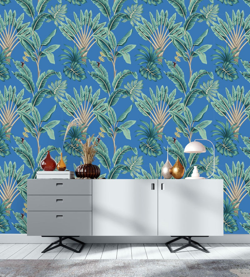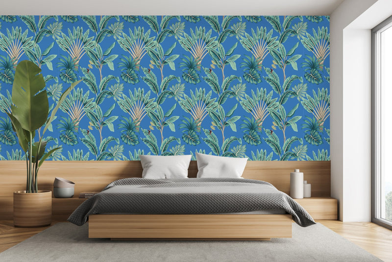 Surround yourself in the warmth and vibrancy of a tropical paradise with uniQstiQ's Blue Wallpaper with Palms. Inspired by the lush vegetation and radiant atmosphere of Florida, each design encapsulates a touch of Miami heat, inviting the outdoors into your living space. Our wallpaper patterns feature exuberant banana leaves, swaying palm fronds, and an intoxicating jungle theme that perfectly harmonizes with a tropical aesthetic.
