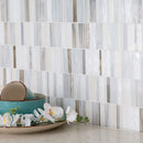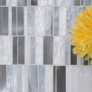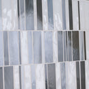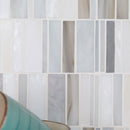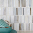 Citi Stax Griege and Lapis Film Face Glass Mosaic Tiles' unique stacked pattern creates depth and interest, drawing the eye both vertically and horizontally. The tiles soft, muted natural hues add subtle sophistication. Made from glass, Citi Stax Griege and Lapis tiles are strong and low maintenance, making them a perfect addition to residential or light commercial rooms. Stacked horizontally in an offset pattern, which adds an element of intrigue, the tiles add a distinctive design element to any residential or light commercial space. Use them in the bathroom, kitchen, or another vertical application to create something unexpected.