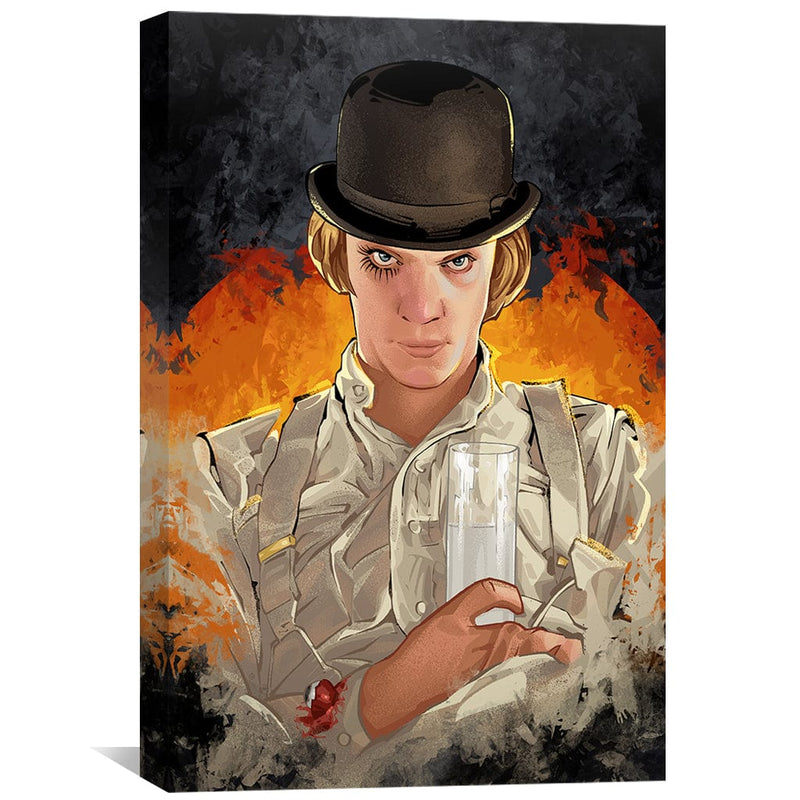 Make your wall pop with artwork from A Clockwork Orange! This print will show off enthusiasm for your favorite movie. The use of orange, white, and black draws attention to any room. Add this design to give your walls a special look! Our canvases come in many types and sizes, so customize what is best for you.