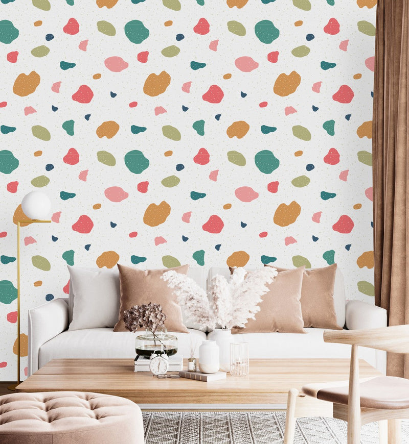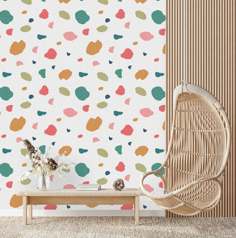 Welcome to uniQstiQ's Colored Spots Wallpaper, where modern artistry meets effortless installation. Our dynamic patterns are perfect for the contemporary minimalist looking to upgrade their space without leaving any marks on the walls. With our easy-to-install peel-and-stick and pre-pasted options, you can redefine your space as often as the shifting shapes in a kaleidoscope.