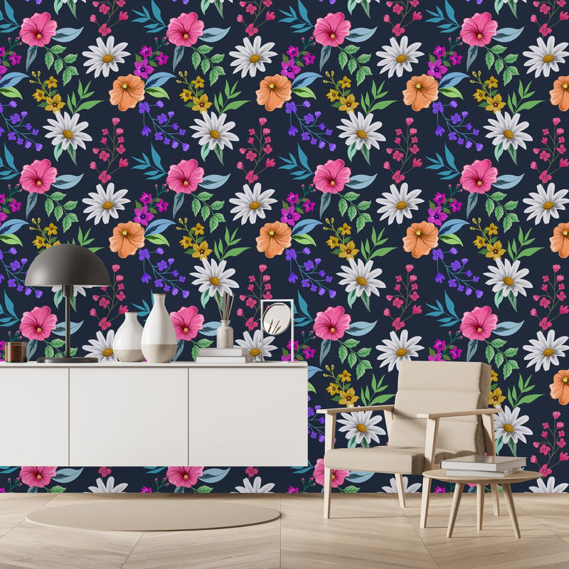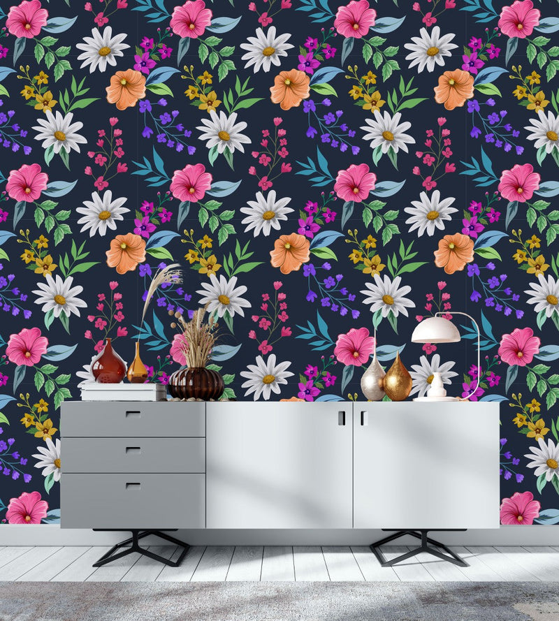 Contemporary Dark Blue Floral Wallpaper Tasteful