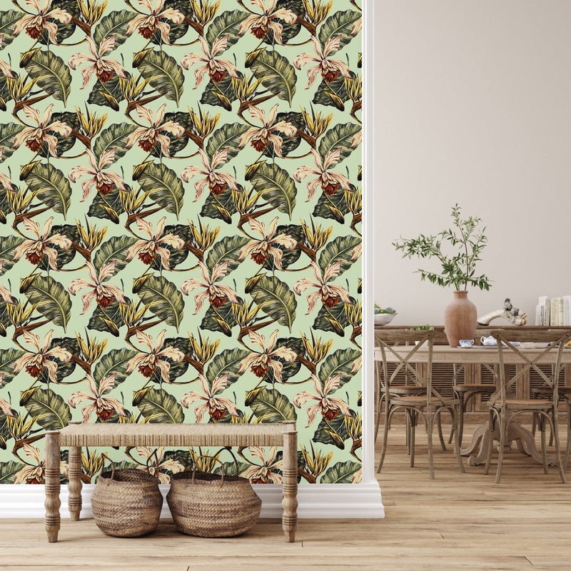 Surround yourself in the warmth and vibrancy of a tropical paradise with uniQstiQ's Green Wallpaper with Leaves. Inspired by the lush vegetation and radiant atmosphere of Florida, each design encapsulates a touch of Miami heat, inviting the outdoors into your living space. Our wallpaper patterns feature exuberant banana leaves, swaying palm fronds, and an intoxicating jungle theme that perfectly harmonizes with a tropical aesthetic.