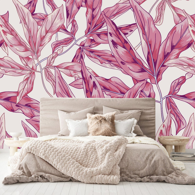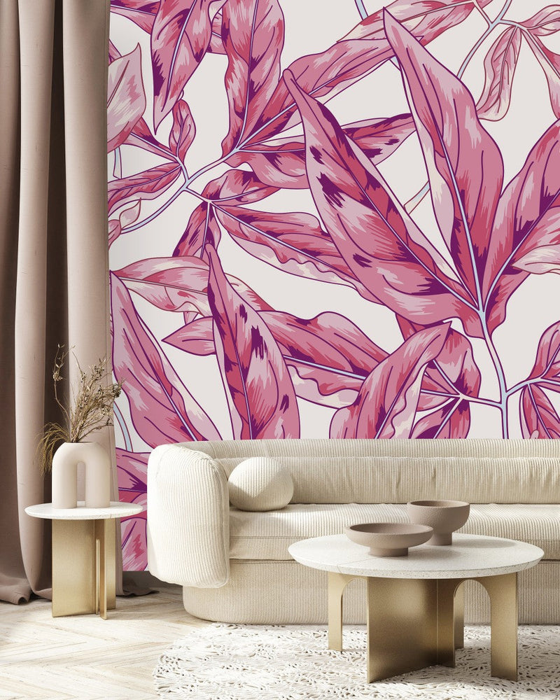 Step into a world of transformative aesthetics with uniQstiQ's Pink Leaves Wallpaper. Distinctly different from traditional wallpaper, our murals don't follow the rhythm of repetitive patterns but instead, unfold in a sweeping narrative across your walls. They're created on a grand scale, designed to cover large expanses without the need to piece together patterns or navigate repeating designs.