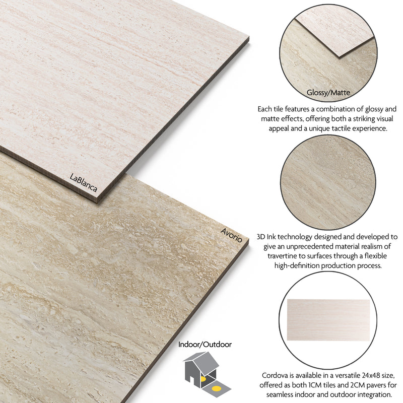 Step into luxurious outdoor sanctuaries with Cordova Avorio Pavers, effortlessly merging artistic finesse and cutting-edge 3D technology to encapsulate the everlasting charm of travertine-inspired porcelain. Crafted with meticulous precision in Italy, these porcelain pavers unveil a mesmerizing dance of matte and glossy finishes, enhancing cool white shades adorned with natural stone veins. The generously sized 24” x 48” tiles revolutionize outdoor aesthetics, providing versatility in installation—whether together or separate—for driveways, patios, pool surrounds, and more. Expanding beyond the outdoor realm, the intricate design seamlessly continues with matching pool copings, ensuring a smooth transition between your outdoor spaces. Indoors, the elegance endures with complementary tiles. Cordova Avorio Pavers redefine the spectrum of possibilities, effortlessly merging the timeless allure of travertine with contemporary porcelain innovation, delivering sophistication and durability to enhance your outdoor retreats with unmatched style.