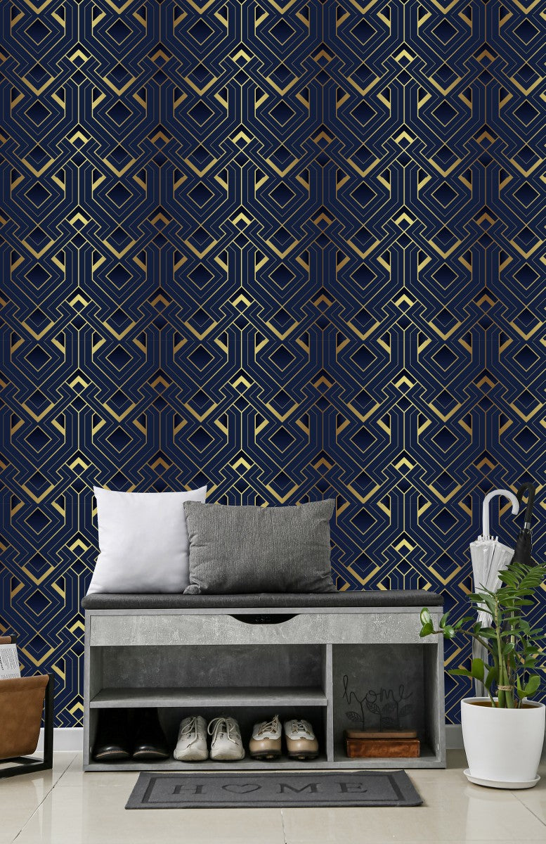 Welcome to uniQstiQ's Dark Blue and Gold Design Wallpaper, where modern artistry meets effortless installation. Our dynamic patterns are perfect for the contemporary minimalist looking to upgrade their space without leaving any marks on the walls. With our easy-to-install peel-and-stick and pre-pasted options, you can redefine your space as often as the shifting shapes in a kaleidoscope.