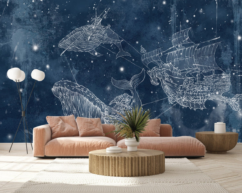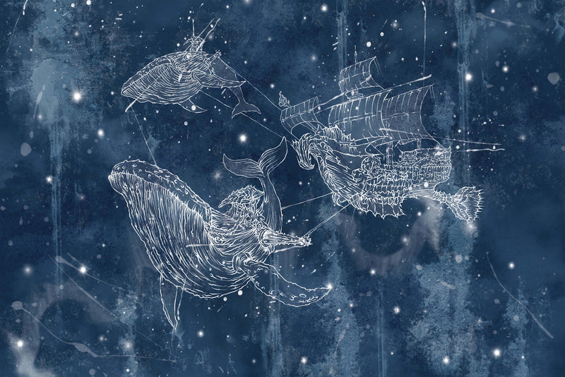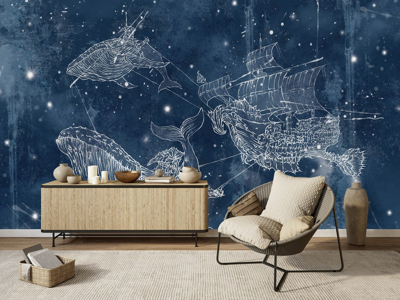 Welcome to the grandeur of uniQstiQ's Dark Whales Wallpaper. These majestic pieces elevate beyond the size of our standard murals, offering a monumental scale for those who crave even more visual impact. Each long mural unfolds a stunning narrative across your walls, free from the constraints of repetition, making each inch of your space a unique spectacle.