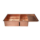 The Drop-In Double Bowl Copper Kitchen Sink features a distinct hammered texture that adds a rustic, handcrafted appearance. Its two well-defined compartments offer ample space for washing and preparing food, making it a functional addition to a busy kitchen. The integrated draining board on one side showcases a series of grooves that allow water to drain away easily, preventing pooling. The sink's rich copper hue provides a warm, inviting glow, and the visible welds highlight the artisanal quality of the double basin sink. The drop-in design of the sink protrudes slightly, showcasing the texture and craftsmanship, which can serve as a statement piece in a farmhouse-style or traditionally designed kitchen. This type of sink is often celebrated for its durability and natural antibacterial properties, making it a practical and stylish choice for a home renovation or upgrade.