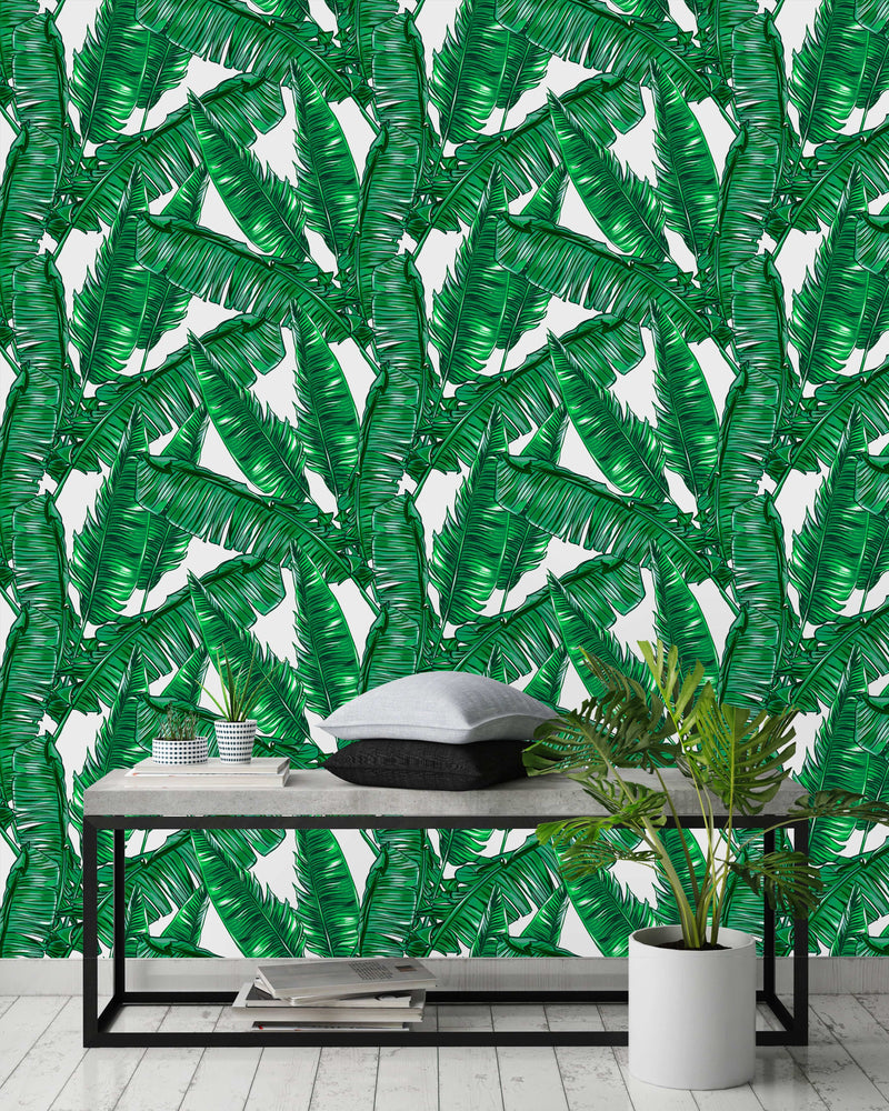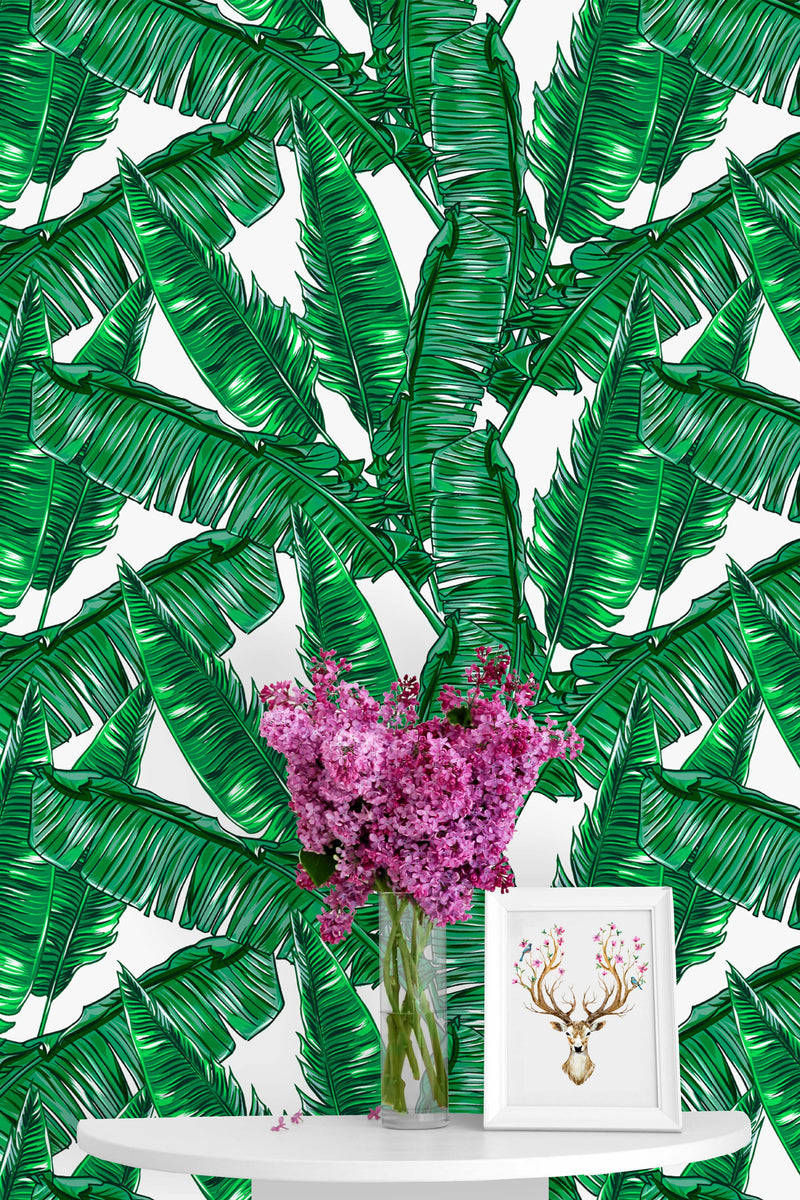 Surround yourself in the warmth and vibrancy of a tropical paradise with uniQstiQ's Green Banana Leaves Wallpaper. Inspired by the lush vegetation and radiant atmosphere of Florida, each design encapsulates a touch of Miami heat, inviting the outdoors into your living space. Our wallpaper patterns feature exuberant banana leaves, swaying palm fronds, and an intoxicating jungle theme that perfectly harmonizes with a tropical aesthetic.