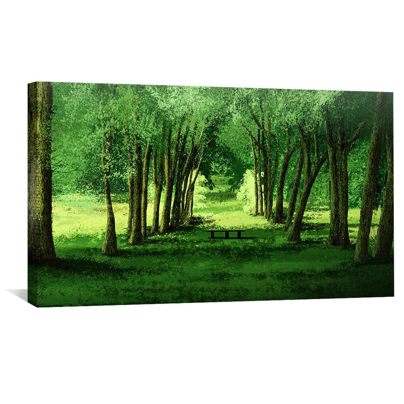 Indulge in the tranquility of "Emerald Grove," an enchanting art depiction of a lush forest with a quaint bench nestled along a winding pathway. Rich green and earthy brown hues intertwine, evoking a sense of serenity. Elevate your space with this captivating scene, available as wall art, canvas wall art, and framed wall art.