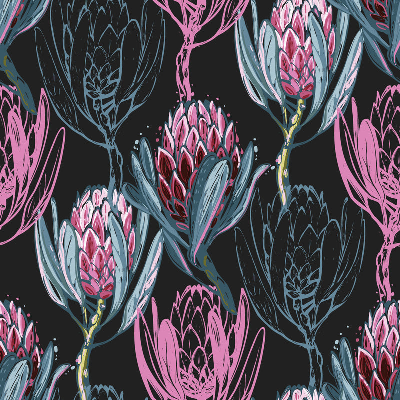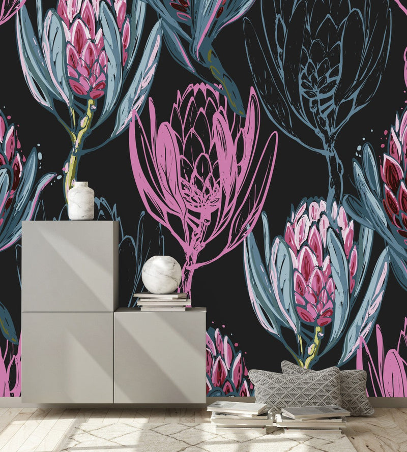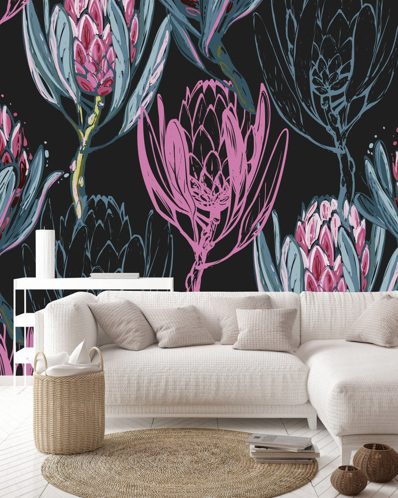 Surround yourself in the warmth and vibrancy of a tropical paradise with uniQstiQ's Dark Wallpaper with Protea. Inspired by the lush vegetation and radiant atmosphere of Florida, each design encapsulates a touch of Miami heat, inviting the outdoors into your living space. Our wallpaper patterns feature exuberant banana leaves, swaying palm fronds, and an intoxicating jungle theme that perfectly harmonizes with a tropical aesthetic.