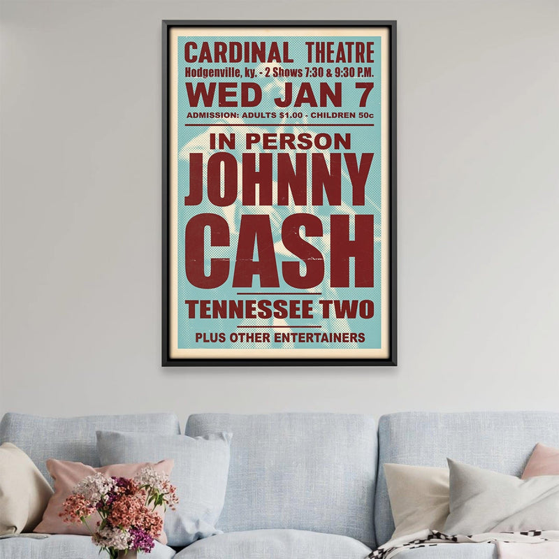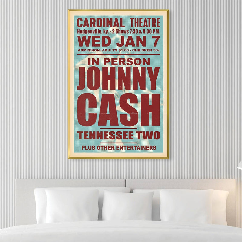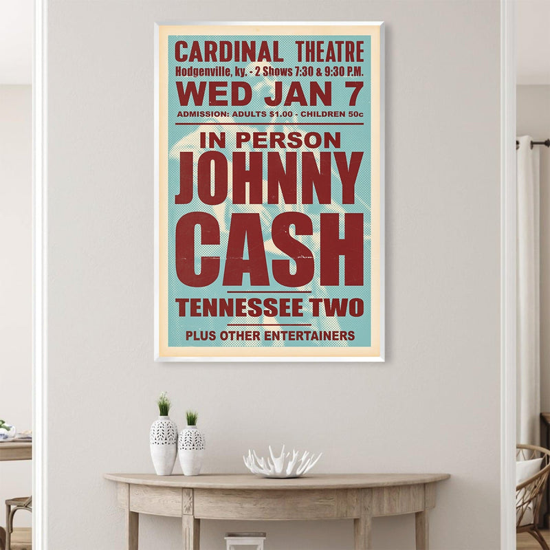 Celebrate the timeless music of Johnny Cash with our "Johnny Cash & the Tennessee Two 1959" canvas wall art. This striking poster pays homage to the legendary musician and his iconic band, capturing a moment in their historic journey. The title "Johnny Cash & the Tennessee Two 1959" perfectly describes the artwork, highlighting the specific year and the significant partnership between Johnny Cash and his talented bandmates. The use of blue, maroon, and white colors adds a touch of vintage elegance, reflecting the era and the spirit of Cash's music. Available as both framed wall art and canvas wall art, this piece is a must-have for fans of Johnny Cash or those who appreciate the enduring legacy of country music. Let "Johnny Cash & the Tennessee Two 1959" become the centerpiece of your space, infusing it with the soulful energy of the Man in Black and reminding you of the timeless power of music.