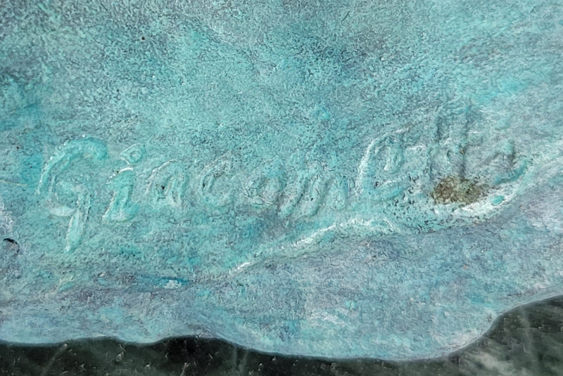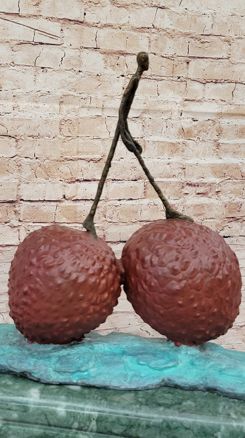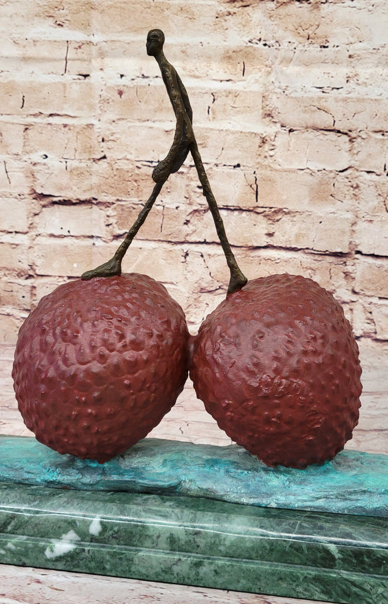 This striking piece stands on a variegated green marble base, providing a stable and elegant foundation for the artwork. The unique combination of the vibrant bronze strawberry and the walking man pays homage to Giacometti's style, making it a captivating addition to any art collection or as a statement piece in a contemporary space.