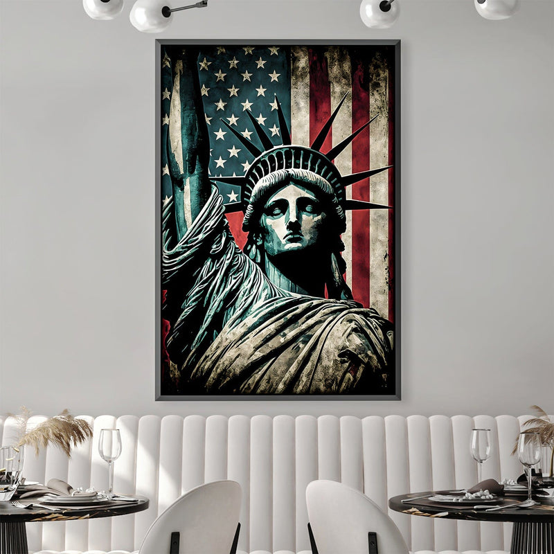Bring the essence of patriotism to your home or office with our canvas wall art featuring Lady Liberty enlightening the world with an American flag in the background. The striking white, blue, and red color scheme creates a bold and beautiful image that is perfect for any decor. This high-quality canvas wall art is available framed or unframed and is sure to make a statement in any room. Whether you are looking to add a touch of national pride or simply enhance your decor, this canvas wall art is a perfect choice. Add it to your collection today and show your love for the country.