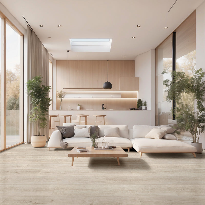 - 9”x48” planks offered in a range of blonde and light brown wood aesthetics that exude undeniable charm and elegance.