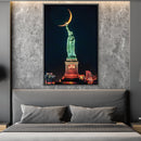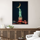 Introducing "Liberty Crescent" canvas wall art, a stunning photographic portrayal of the iconic Statue of Liberty with a crescent moon in the background. The vibrant green, red, and yellow colors of this art piece evoke a sense of patriotism and freedom. Printed on high-quality canvas, this artwork is perfect to add a touch of elegance and charm to any room in your home or office. The framed wall art version is ready to hang right out of the box, providing a hassle-free decorating solution.