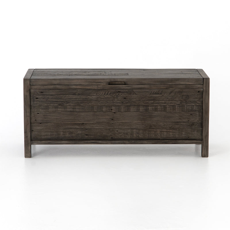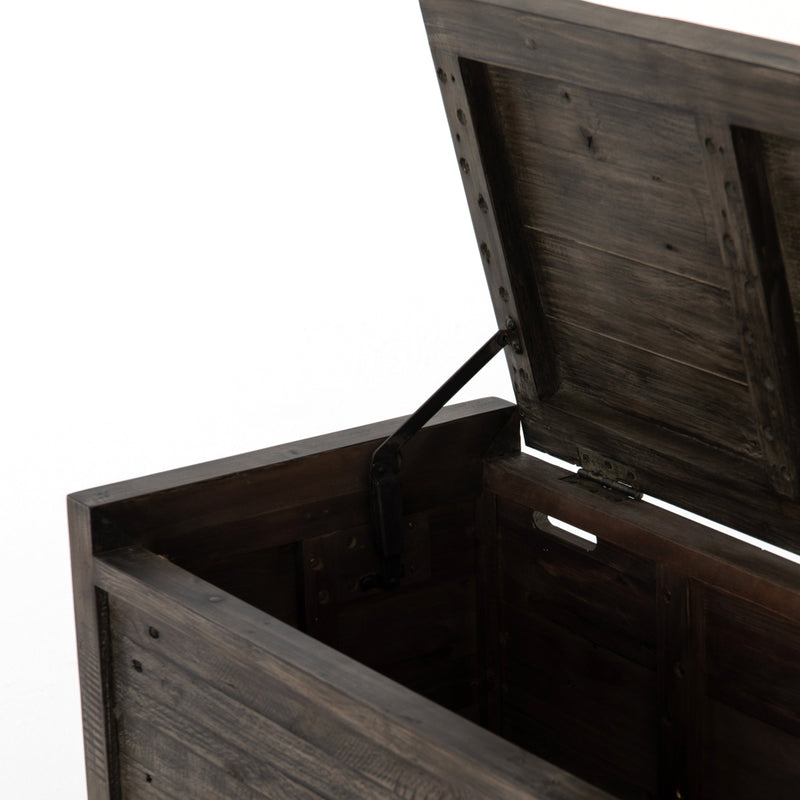 Mixed reclaimed woods are finished in a rustic black olive, bringing depth to streamlined shaping. Spacious trunk for blanket storage, perfect at the foot of bed.