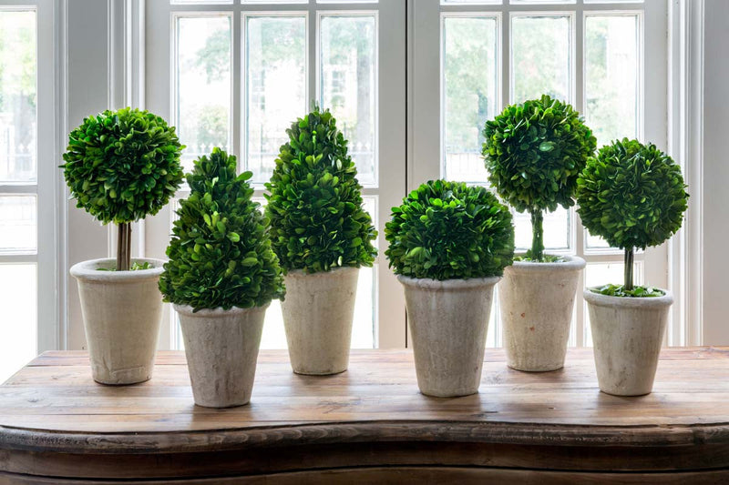 This collection of preserved boxwood topiaries, made from real boxwood leaves, can be used throughout the home, together to make a statement or separately, year-round.