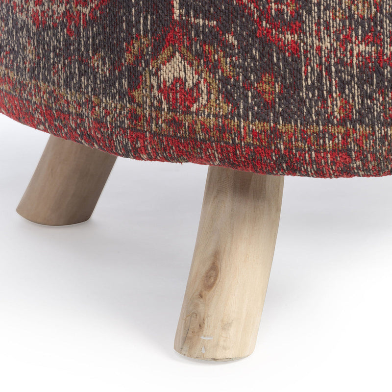 The best way to put up your feet or use for extra seating is this stylish stool covered in a distressed cotton chenille inspired by Turkish rugs. With its rich color combination of garnet and navy it is complemented by its rustic legs. We offer this pattern in a rug as well.