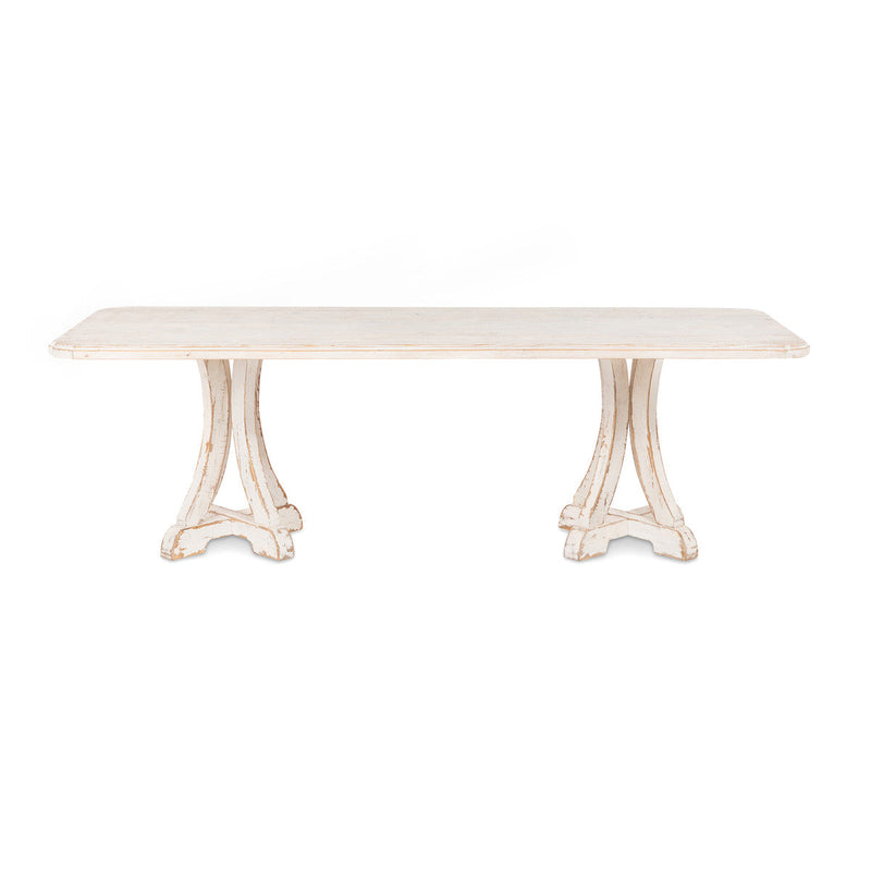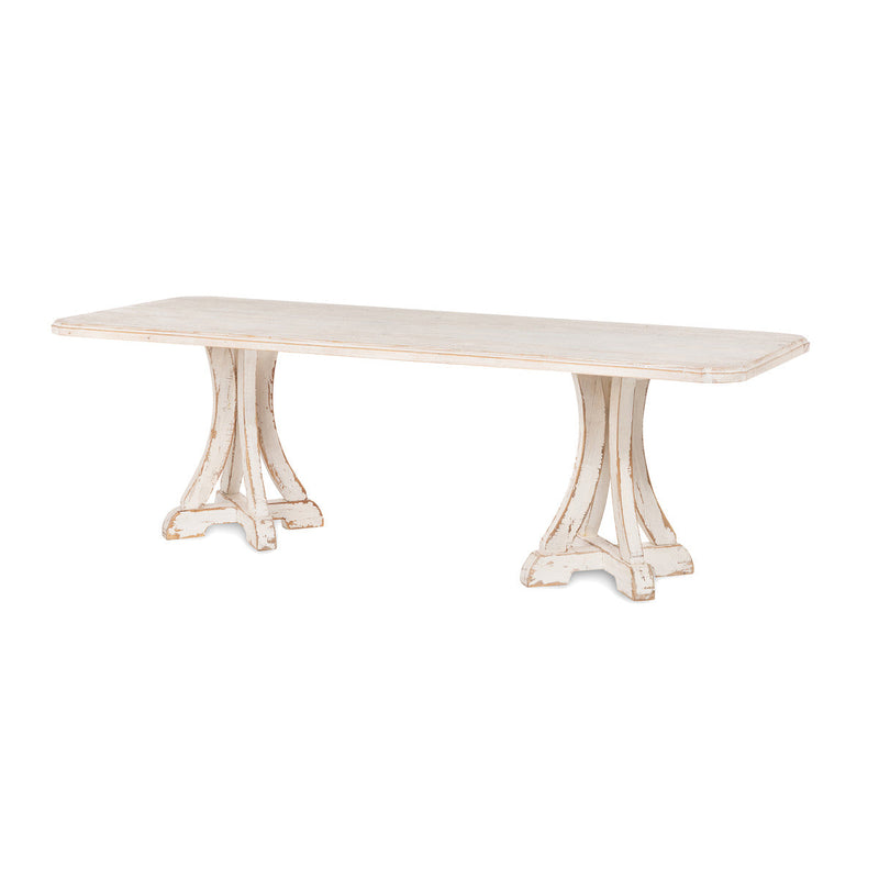 The refined curves of the balusters and the gently rounded edges on the Elisa Dining Table balance casualness with sophistication. The antique white washed pine is an eye-catching centrepiece for a French Country cottage dining room or Farmhouse kitchen.