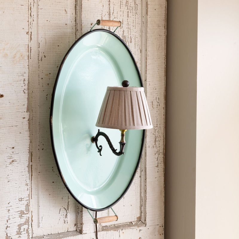 Our enamelware tray has been adapted to a farmhouse style sconce that will add vintage charm to any room.