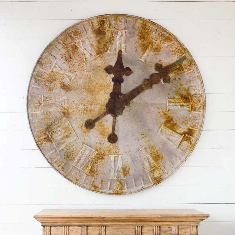 A distressed rust finish brings out the character of this impressive state capitol clock face relic. Sure to make a statement in any setting. Decorative use only, not operational.