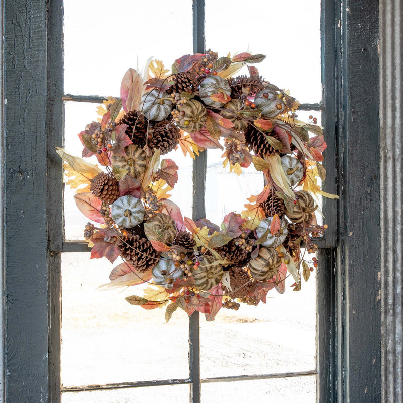 Bring vibrant texture and timeless charm to your space with Lovecup's Farmhouse Fall Wreath. Capturing the essence of the season with its careful blend of autumn leaves, pinecones, and whitewashed pumpkins, this wreath evokes all the beauty of the harvest and will provide an elegant detail of luxury and warmth to any décor.