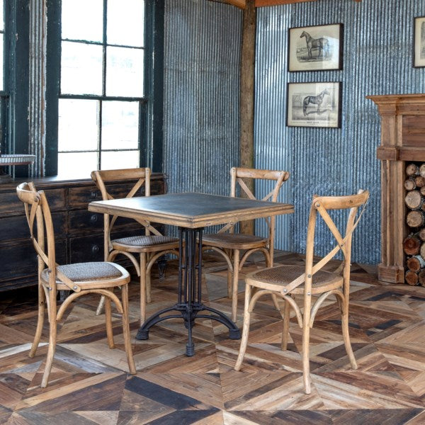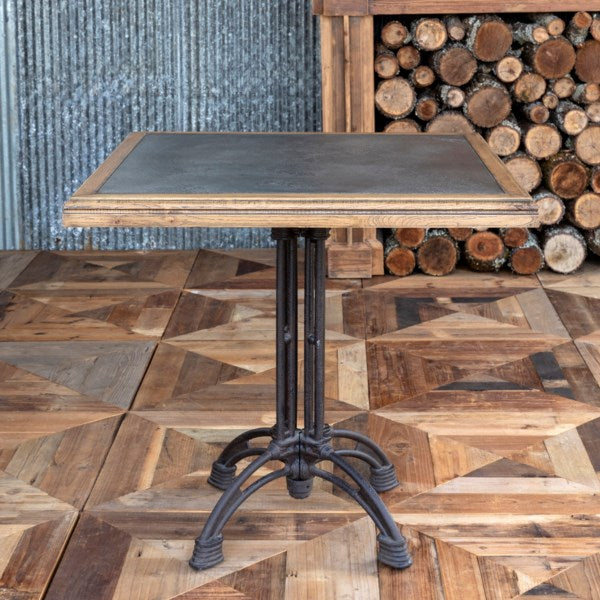 A combination of wood and metal, this industrial-style square cafe table features a zinc top.