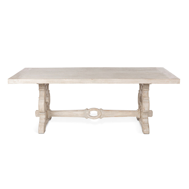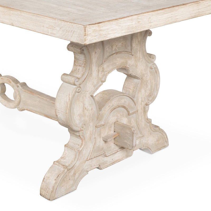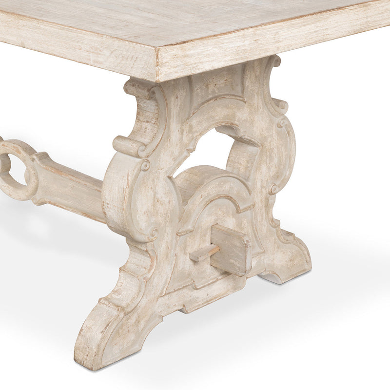 Elevate your dining room with the solid pine Lovecup Genevieve Dining Table. This unique table boasts a stunning trestle base, providing extra legroom and a sturdy construction. The whitewashed finish and French scrolled details add a touch of extravagance to your space. With seating for eight, it's the perfect option for gatherings and a stylish focal point.