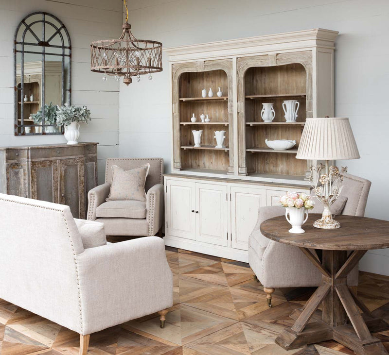 With its distressed antique white paint finish and intricate floral details, this metal flower lamp is blooming with exquisite detail and aged charm. Topped with a neutral pleated fabric shade.