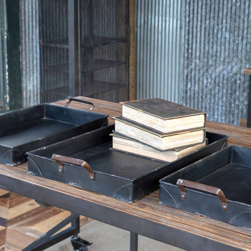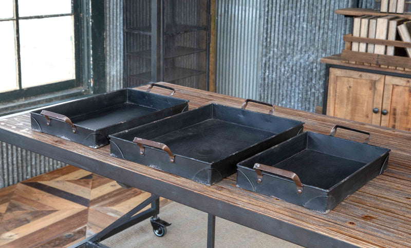 Perfect for organization and display, these metal office trays feature a lightly distressed black paint finish. Set of 3, sizes small, medium, and large.