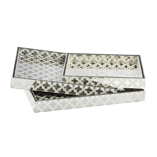 The quatrefoil motif on our Mary Tray Set brings a gothic dose of beauty to these decorative accents that are also useful in serving beverages during a party, storing files and papers at the office or gathering ideas for a creative project. The mirrored surfaces on which the cream pattern is stamped make these trays glint so beautifully, they’ll be lovely accoutrements even when they are nested and empty. Measurements of the trays are listed below.