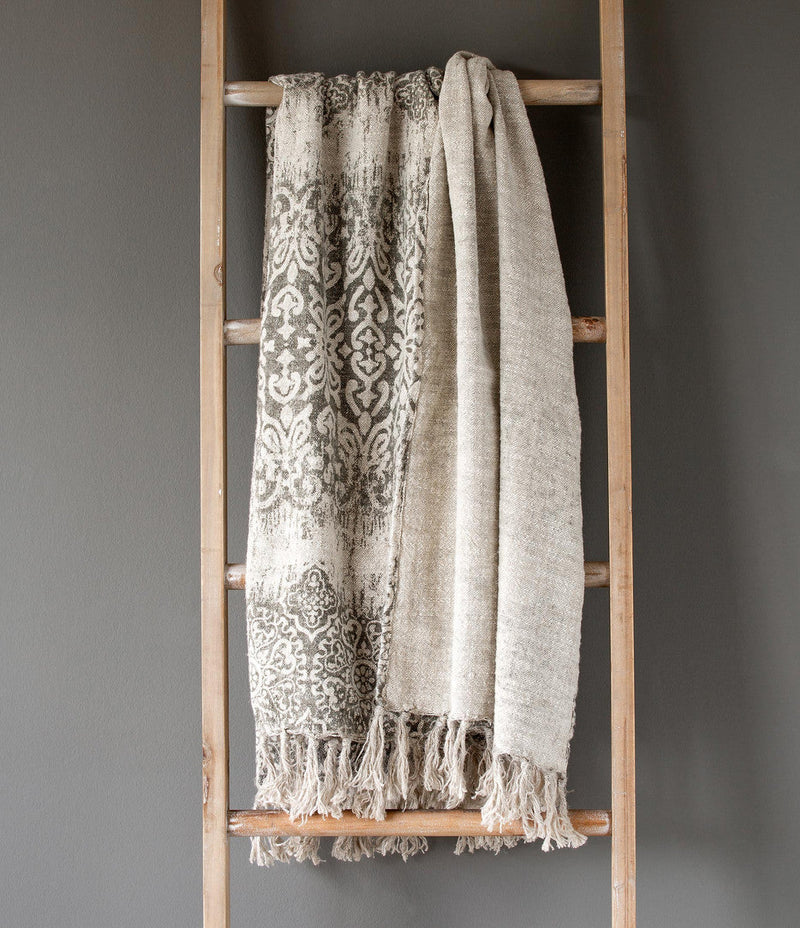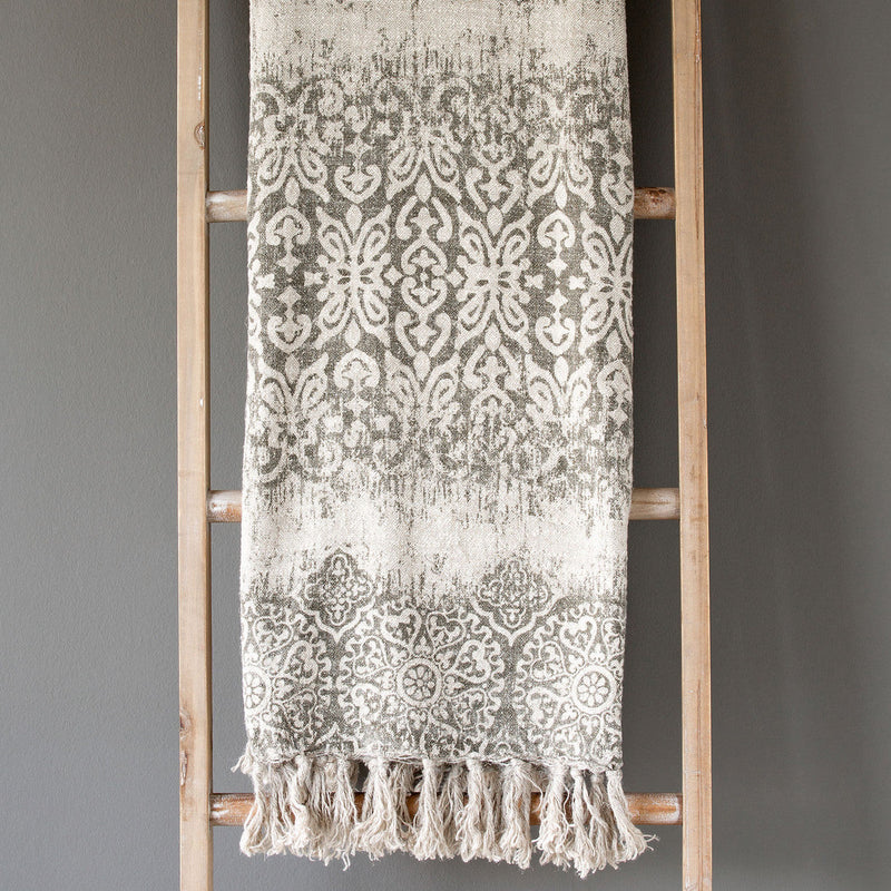 Crafted from a cotton-linen blend with a vintage inspired print in soft grey, this throw is finished with fringe on both ends. Perfect to cozy up under on a cool spring evening. Has matching pillow. Also available in Faded Coral and Indigo colorways.