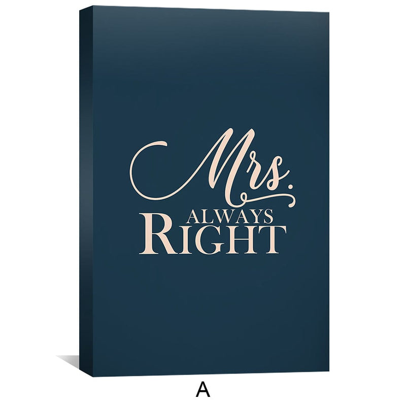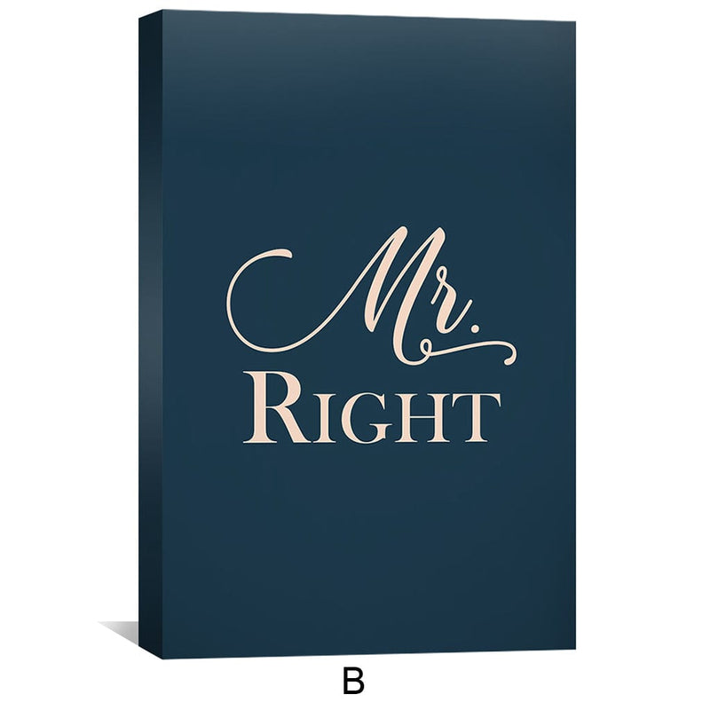 This romantic canvas wall art features the quote "Mr. & Mrs. Right" in beautiful typography set against a navy blue and cream color scheme. This piece of wall art is perfect for any room in your home, it's a perfect way to express your love and commitment to your significant other. The high-quality canvas material and expertly crafted design make this canvas wall art an ideal choice for any wall. Whether you're looking for framed wall art to add to your living room, bedroom, or office, this canvas wall art is a perfect choice. With its timeless design and powerful message, this wall art is sure to be a cherished addition to any collection. So why wait? Add this beautiful canvas wall art to your collection today!