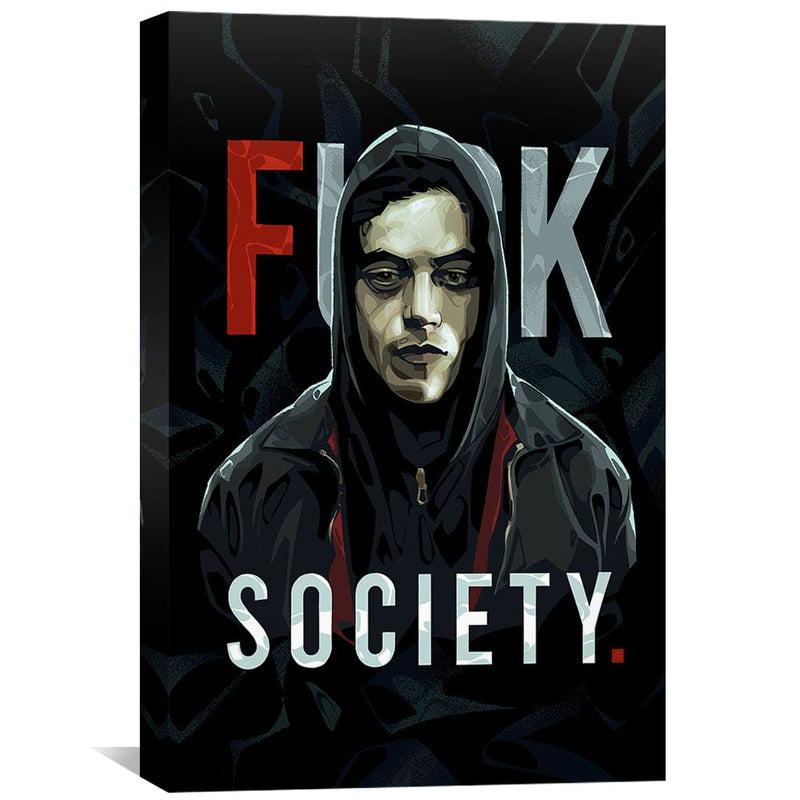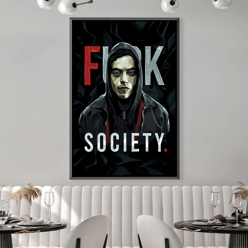 Are you a Mr. Robot fan? Hang this wall art inspired by the show in your home! This art features Elliot Alderson in front of a bold "F Society". These black and red colors are sure to be a standout. Add this to your TV show poster collection or any room to make your walls pop!