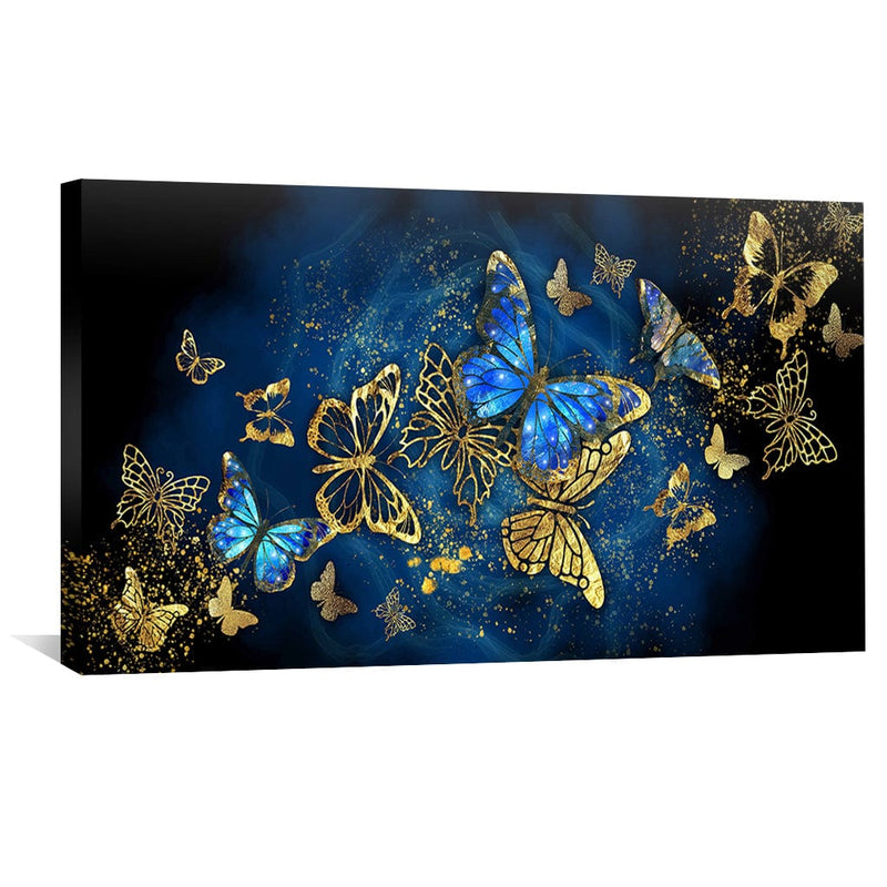 Indulge in the captivating beauty of 'Navy Gold Butterflies' canvas wall art, an abstract masterpiece that showcases an array of resplendent gold and navy blue butterflies, each brought to life through unique textures and mesmerizing splatter effects. The title 'Navy Gold Butterflies' perfectly signifies the elegance and richness of this artwork, painted in a palette of opulent gold, dramatic black, and deep navy blue hues. Elevate your decor with this framed wall art, a captivating masterpiece that celebrates the allure of butterflies and artistic expression through canvas wall art.