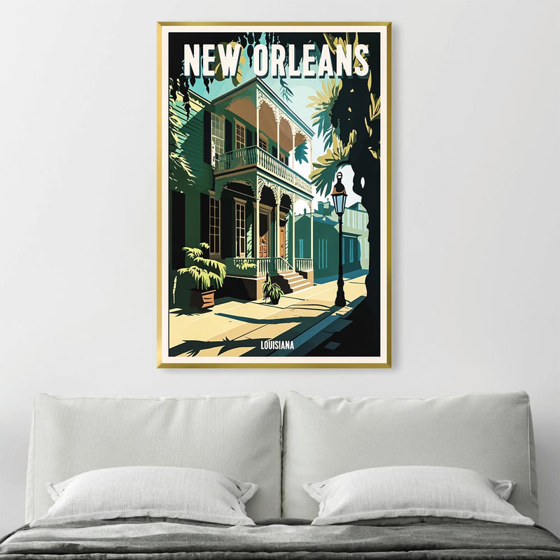Experience the vibrant spirit of New Orleans with our captivating canvas wall art. This stunning illustration transports you to the heart of Louisiana's beloved city, capturing its rich heritage and lively atmosphere. The title "New Orleans" perfectly encapsulates the essence of this artwork, symbolizing the soulful music, flavorful cuisine, and colorful festivities that define the city. The use of green and brown colors adds a touch of natural elegance and earthiness, complementing the unique charm of New Orleans. Elevate your home decor with this remarkable piece of art, available as both framed wall art and canvas wall art. Whether you're a fan of jazz or simply appreciate the vibrant energy of this iconic city, our New Orleans wall art is the perfect addition to any space.