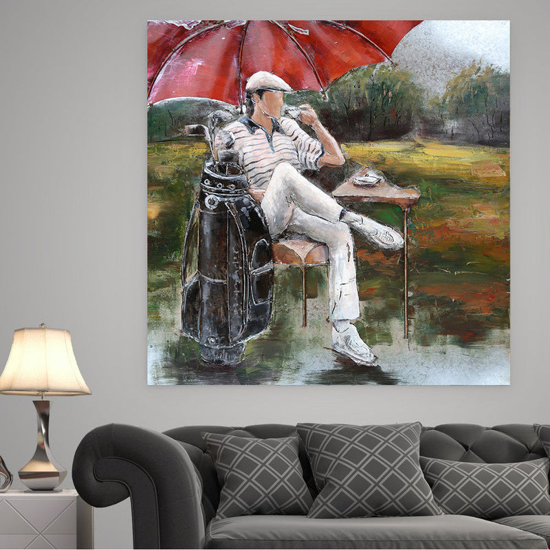 Relaxed Golfer Under Umbrella 3D Mixed Media Metal Cutout Painting Wall Art