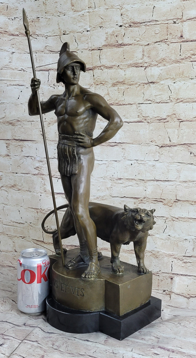 Roman Gladiator Warrior & Lion Bronze Statue Sculpture Signed Original 20" x 13"