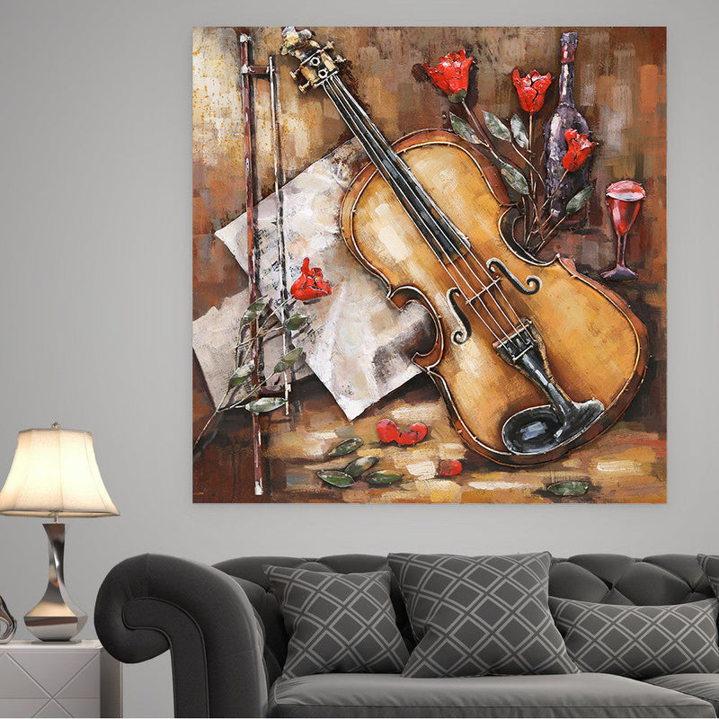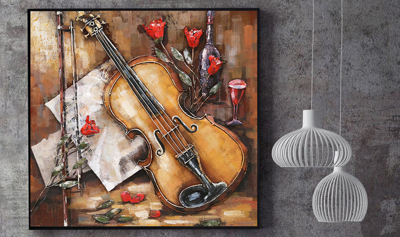 Serene 3D Wall Art Painting Metal Cutout Violin & Roses Musical Decor