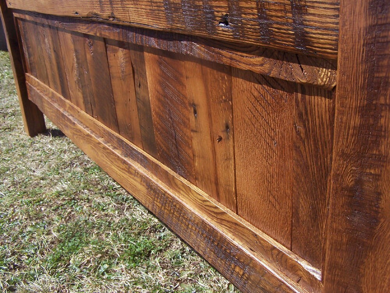This bed stands out for its rugged strength, antique charm, comforting warmth and rustic appeal. Shown in 1800's vintage antique Oak, with sturdy 4x4 corner posts. Also available in knotty pine, wormy antique chestnut, rustic tulip tree and weathered style barn boards.