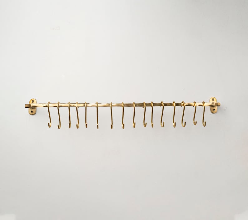 Our Unlacquered Solid Brass Pot Rail with Hooks, a charming Vintage Pot Hanger for your kitchen and beyond. This multi-functional piece seamlessly fits into any indoor space, serving as a stylish kitchen utensil holder for pots, pans, knives, and cooking gadgets. It's equally at home in the bathroom, where it can be used to hang towels, bathrobes, and brushes. Additionally, maximize your organization by utilizing it to store keys, hats, umbrellas, and coats discreetly behind the door.