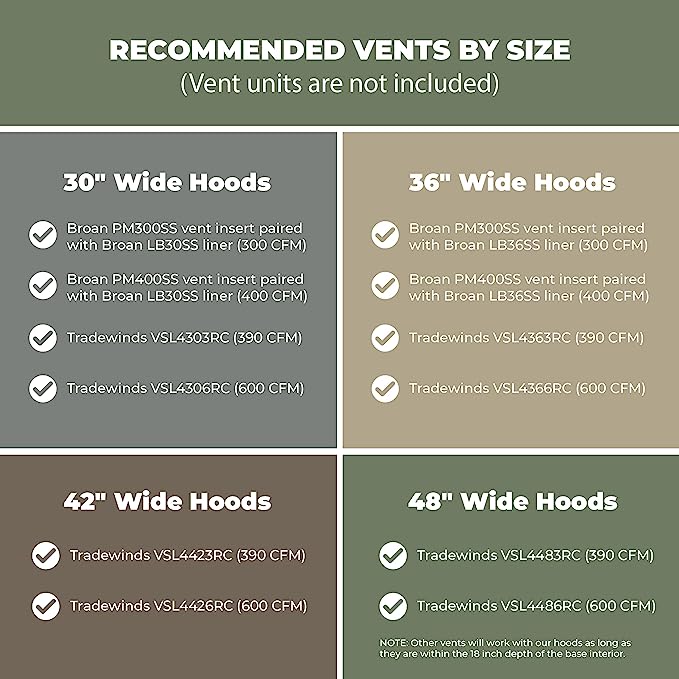 - Broan PM300SS paired with Broan LB36SS (300 CFM)