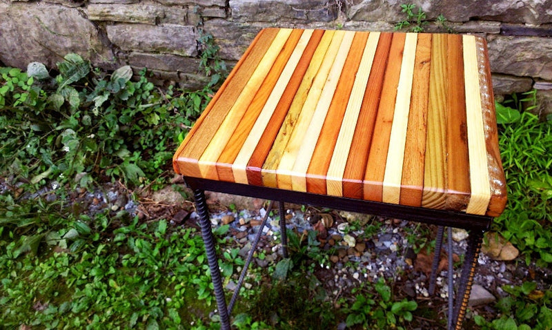 These urban style bar stools were designed for Rocksalt, a Charlottesville VA restaurant - very funky and cool! They are the perfect accent piece for your kitchen, basement bar or work desk. Made with a welded rebar industrial metal frame and colorful strips of a wide variety of reclaimed woods -- tough, durable and very unique :)