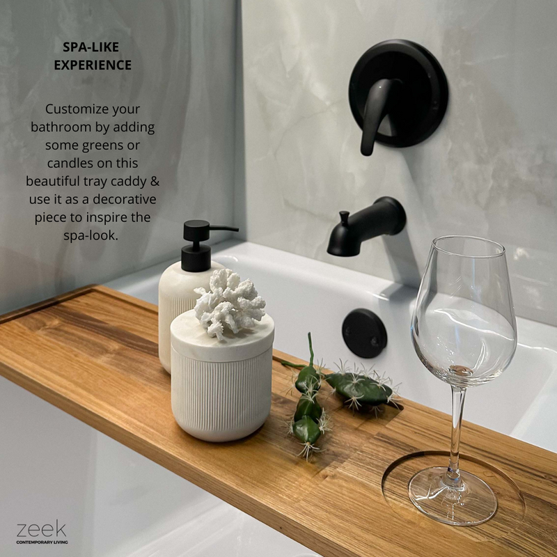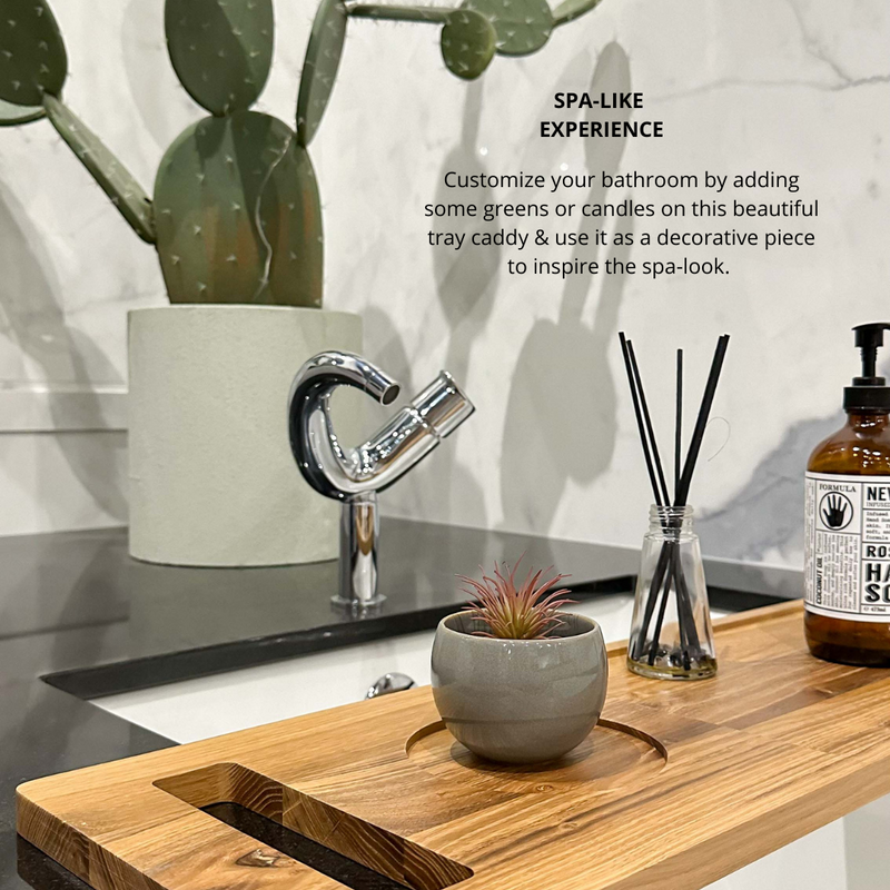 SPA-LIKE EXPERIENCE Relax & enjoy your bath while having your favorite bath related items on this tray caddy at your reach. Customize your bathroom by adding some greens or candles on this beautiful tray caddy & use it as a decorative piece to inspire the spa-look.